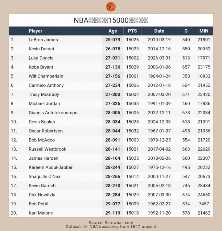 27岁31天的东契奇成为NBA历史第三年轻达成15000分的球员,超越科比(27岁136天),仅次詹姆斯(25岁79天)、杜兰特(26岁78天)。